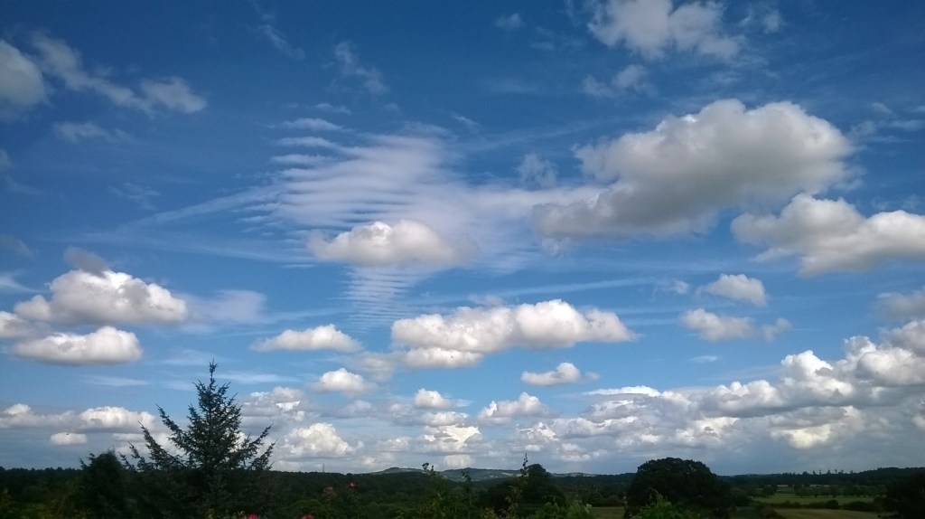 My upstairs study has a wonderful open view over fields, hills, a local bluebell wood and a small lake. Because we are on a hill, there is a vast expanse of sky which is constantly changing. And clouds …I love clouds and recently discovered the word for cloud lover which is nephophile. Daydreaming out of the window, I often see shapes and animals and cities in the sky when I should be writing.